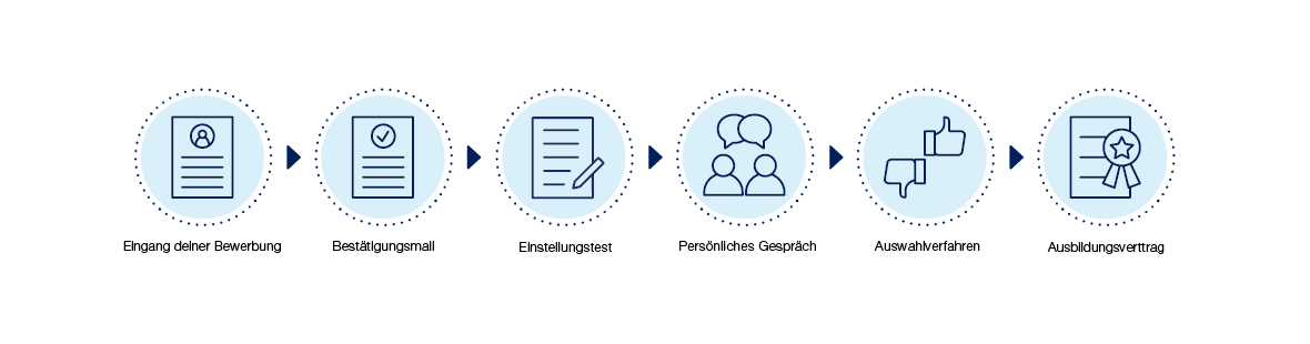Sobald wir Deine Bewerbung erhalten haben, schicken wir Dir eine Bestätigungsmail. Hat uns Deine Bewerbung gefallen, senden wir Dir einen Einstellungstest zu. Schneidest Du hierbei gut ab, laden wir Dich dazu ein, Dich kreativ vorzustellen und auch uns in einem persönlichen Interview kennenzulernen. Wenn beides sowohl für Dich als auch für uns positiv war, unterschreibst Du schon bald Deinen Ausbildungsvertrag.