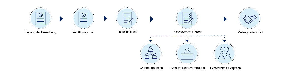 Nach Eingang Deiner Bewerbung erhältst Du eine Bestätigungsmail. Wenn Deine Bewerbung überzeugt, senden wir Dir einen Einstellungstest zu. Bestehst Du diesen erfolgreich, laden wir Dich zu einem Assessement Center ein. Dieses besteht aus Gruppenübungen, einer kreativen Selbstvorstellung und einem persönlichen Gespräch. Wenn Du zu unserem Team passt, steht einer Vertragsunterzeichnung nichts mehr im Weg.