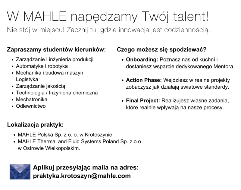 Połącz studia z ekscytującym wglądem w świat pracy wiodącego międzynarodowego partnera rozwojowego i dostawcy dla przemysłu motoryzacyjnego. Nie ma znaczenia, czy dopiero zaczynasz naukę na uniwersytecie, jesteś w trakcie, czy niebawem ją zakończysz. Ukończ staż w MAHLE - tutaj od początku będą Ci przydzielane wymagające zadania. Jeśli chcesz pracować jeszcze w czasie studiów również dajemy taką możliwość.